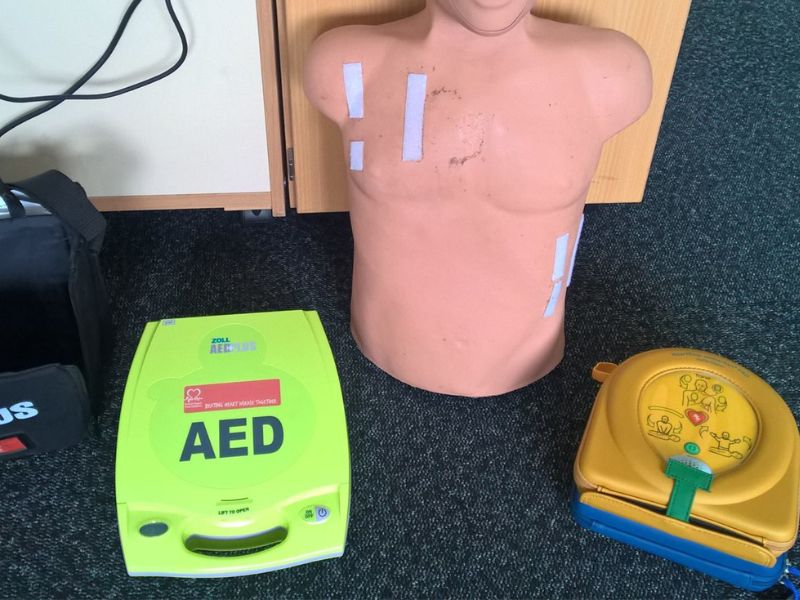 An Automated External Defibrillator (AED) is a portable device used to give the heart an electric shock when someone is in cardiac arrest (their heart has stopped), by allowing the heart to re-establish an effective rhythm.